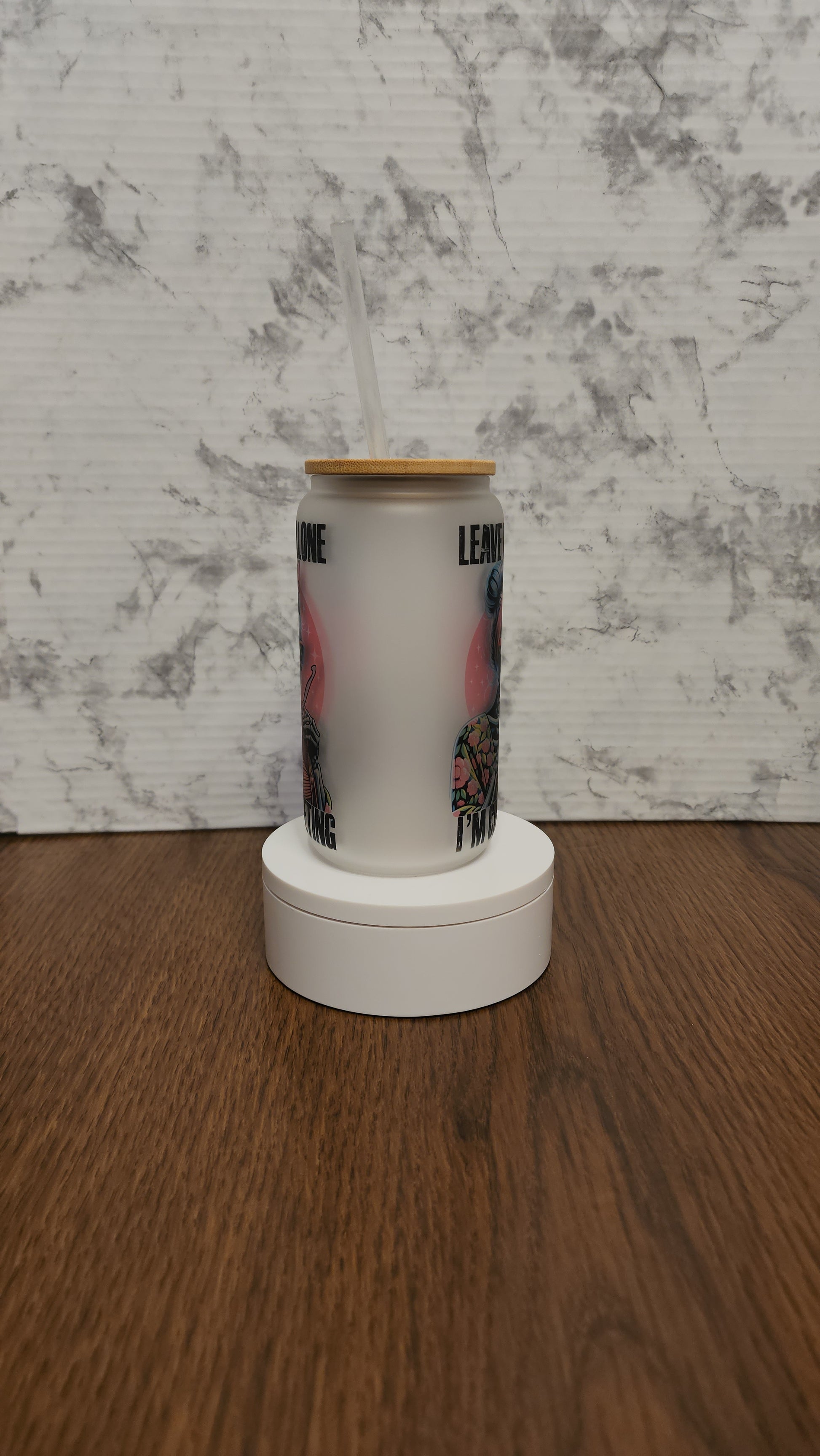 Sublimated frosted 16 oz glass tumbler. Comes with bamboo lid and reusable straw.