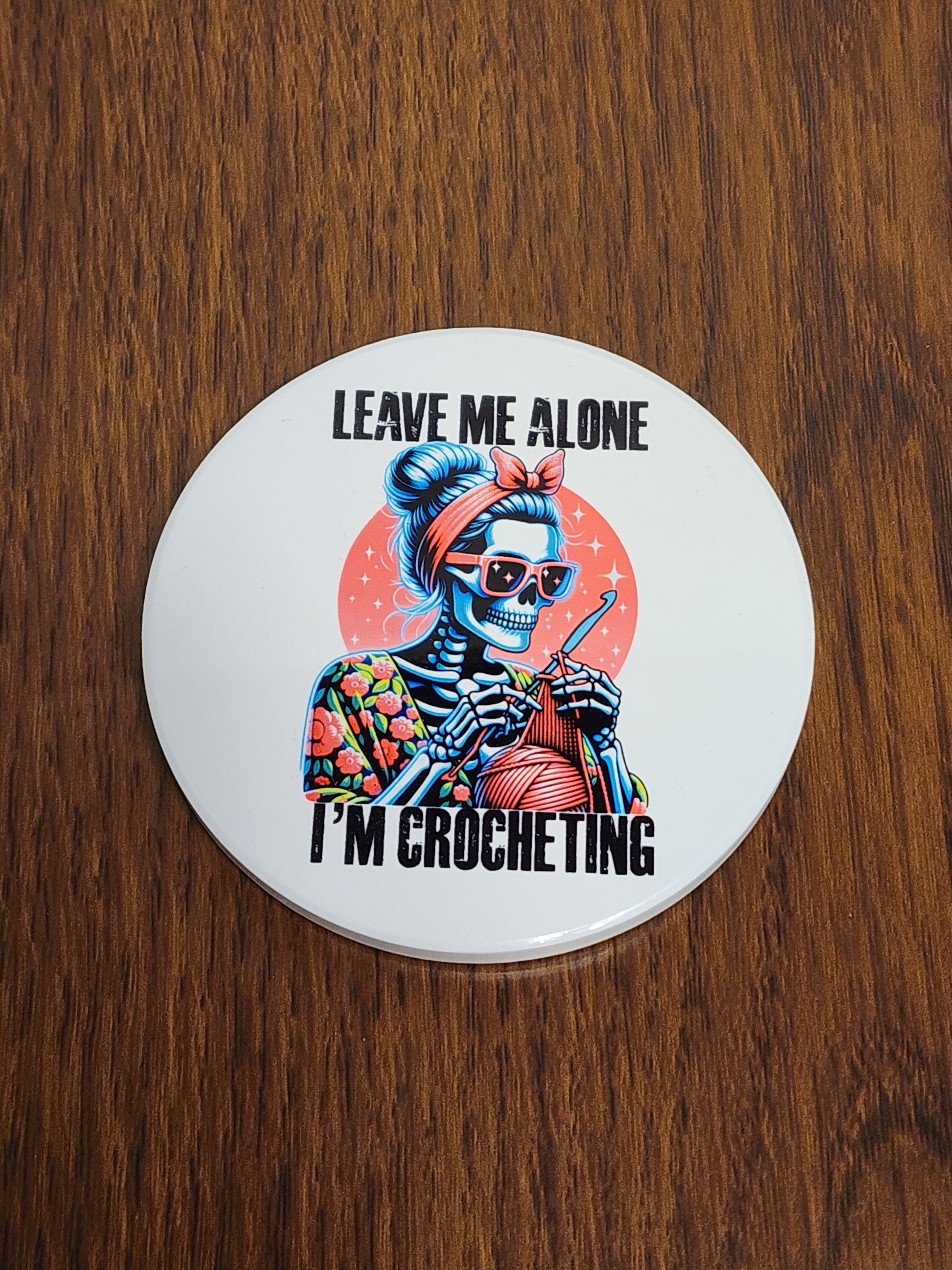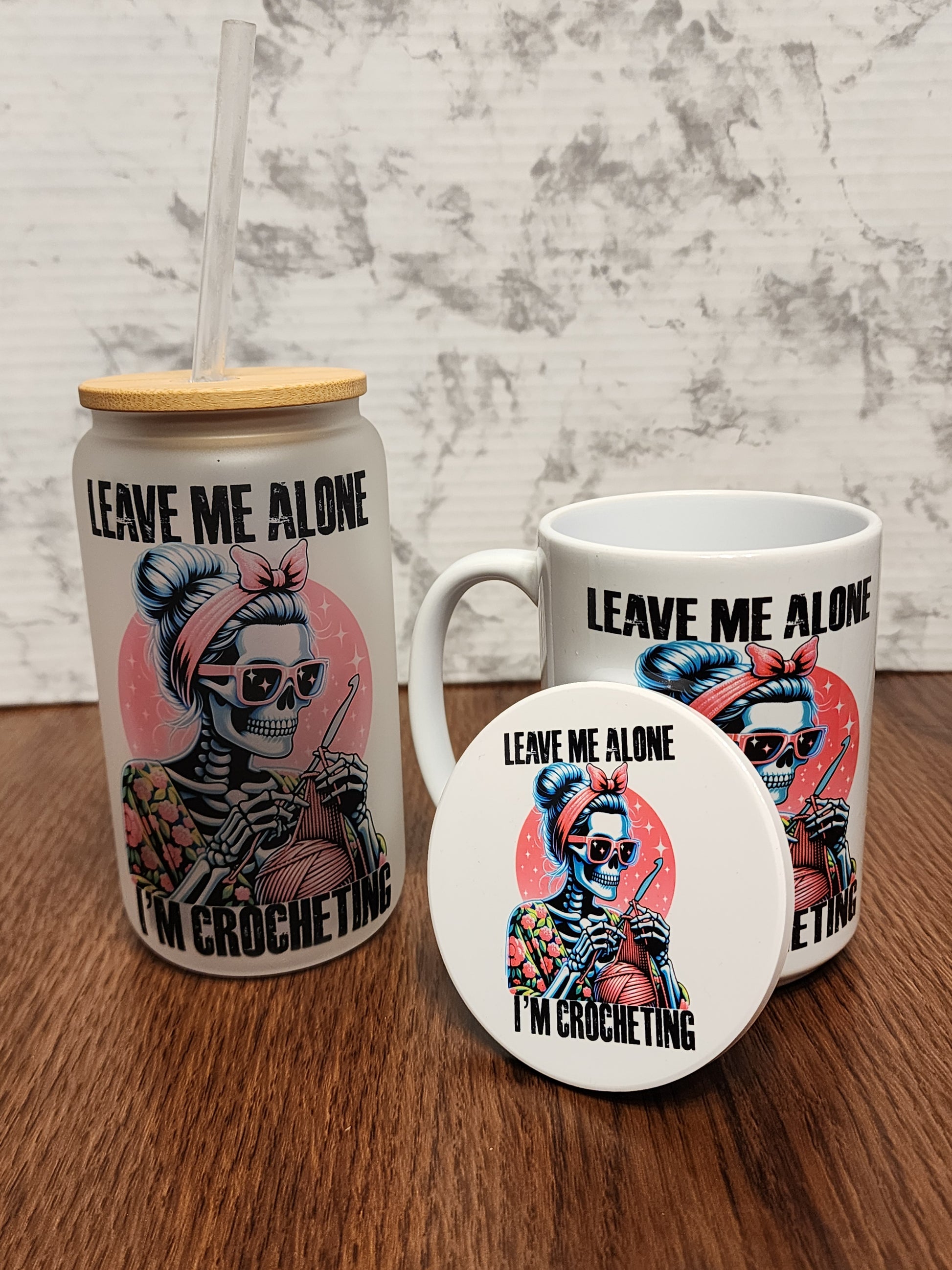 This image is so fun! Skeletan woman crocheting with lots of pink accents.