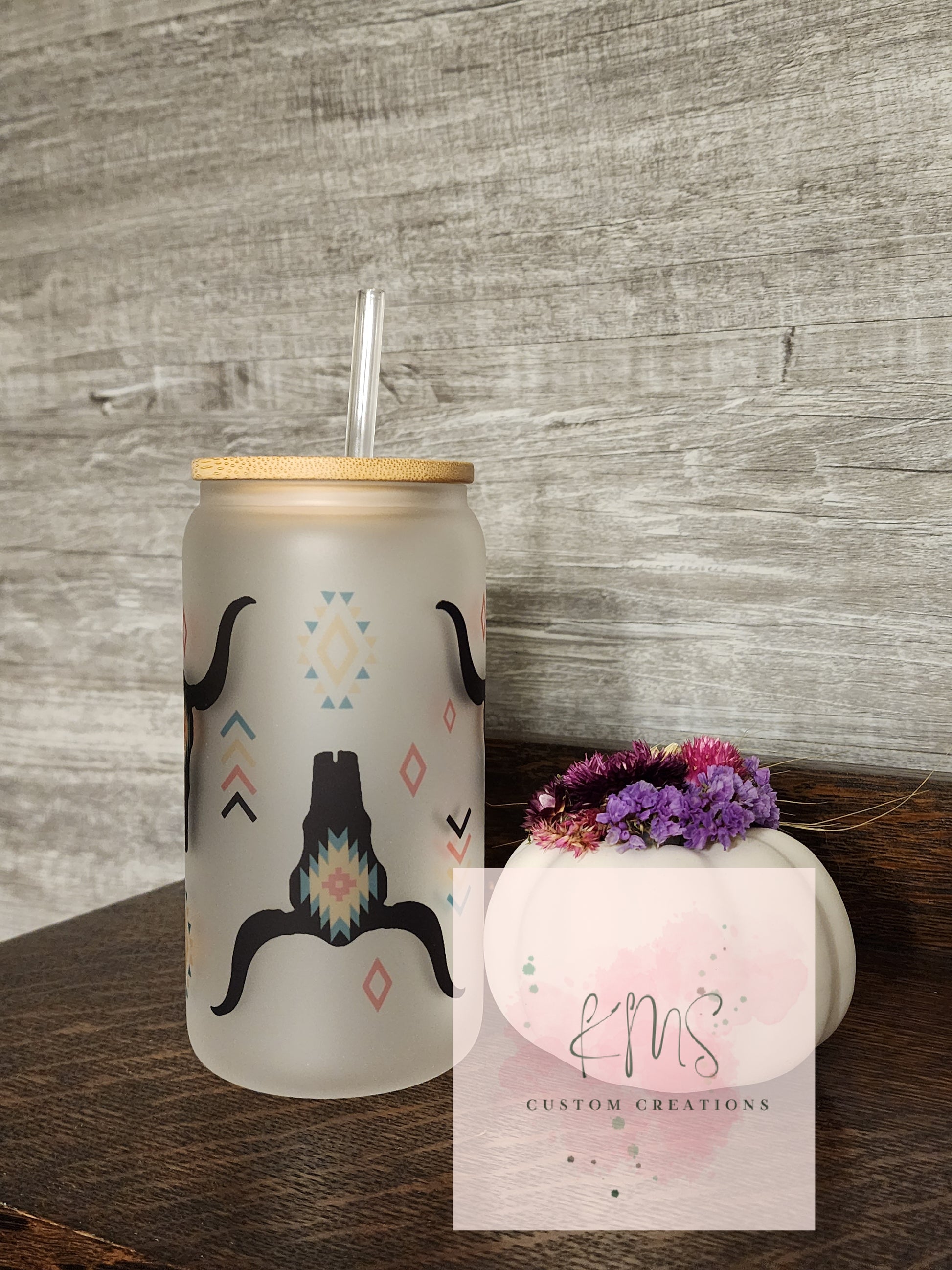 Sublimated frosted 16 oz glass tumbler. Comes with bamboo lid and reusable straw.