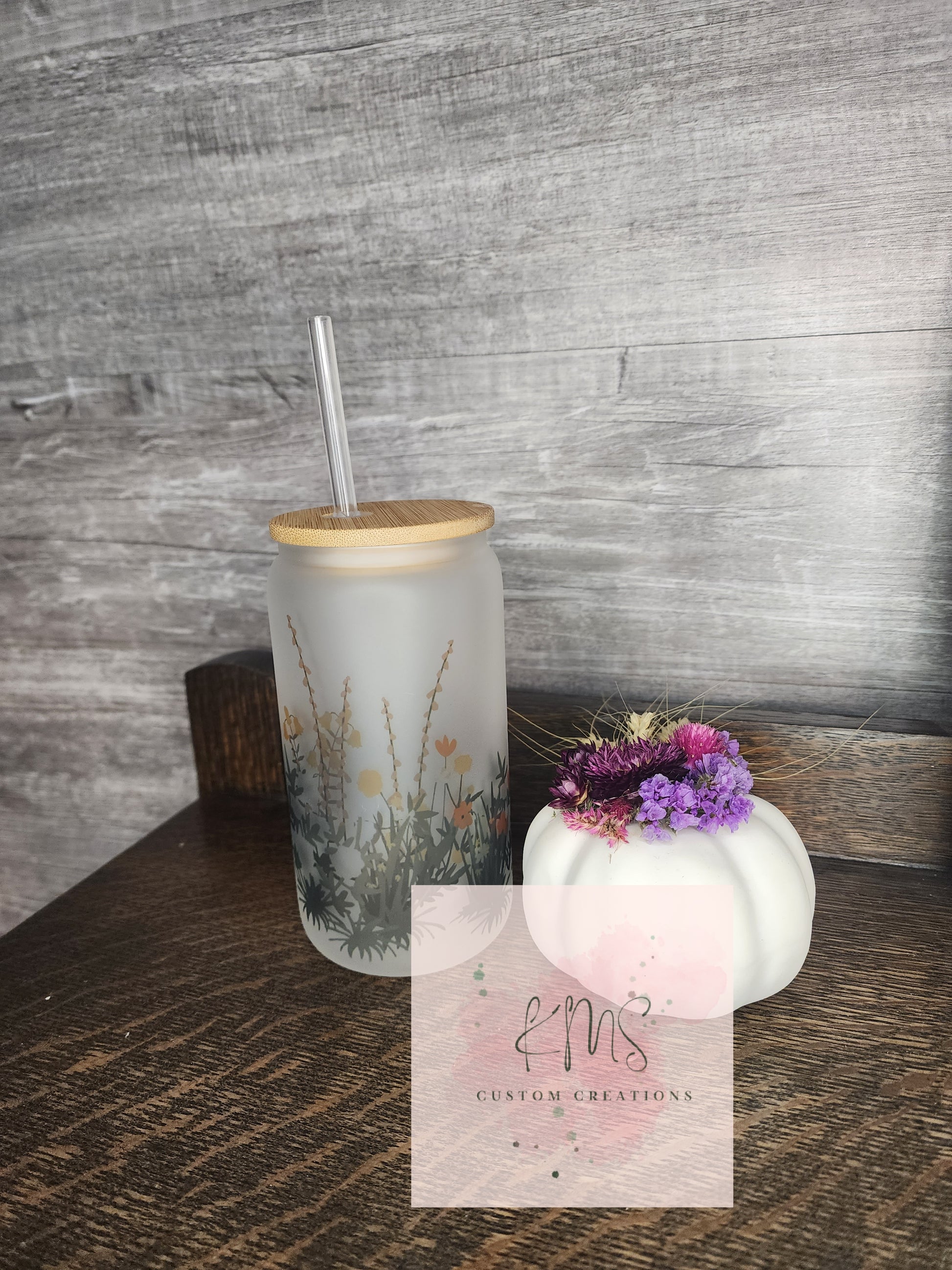 Sublimated frosted 16 oz glass tumbler. Comes with bamboo lid and reusable straw.